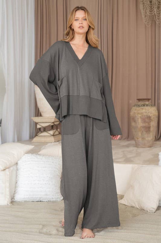 This super-soft top features a stylish contrast rib band and a flattering deep V-front neck—perfect for lounging in style or dressing up for a chill day out!