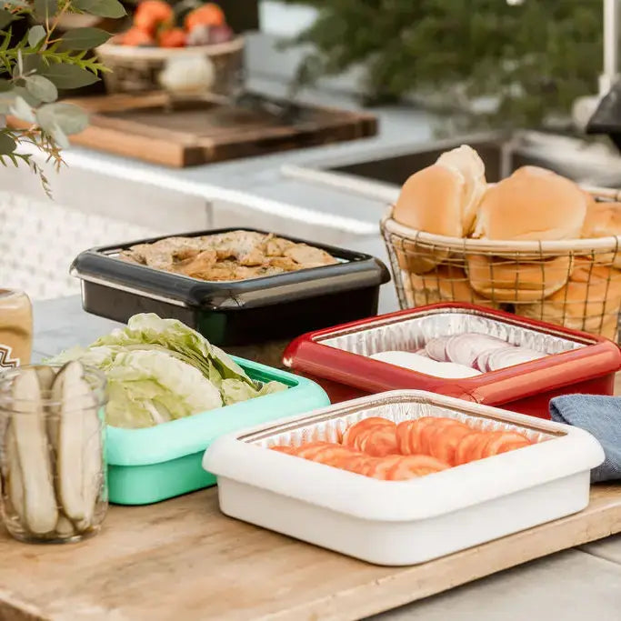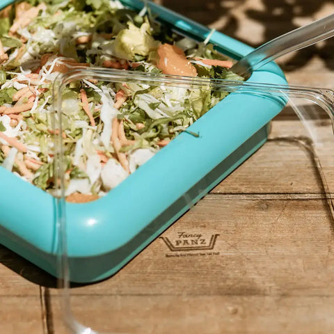 WHAT IS A FANCY PANZ®: Fancy Panz are used to dress up, protect and serve from a foil pan. Our square frame is the perfect size for brownies, dips, salads, appetizers and fudge! Perfect for tailgating, potlucks, outdoor dining, picnics, home and more! WHAT'S INCLUDED: 1 removable clear top 1 8x8 foil pan 1 reusable serving spoon EASY TO USE: Open the frame, place your filled foil pan inside, and snap on the clear lid. Works with hot or cold food, straight from the oven or fridge. TWO WAYS TO SERVE: Use the clear lid as a trivet or keep it on to maintain food temperature and keep bugs out. EASY CLEANUP: Remove the foil pan and take your Fancy Panz home—leave the leftovers behind. IDEAL FOR TRAVEL: Stackable and sturdy, Fancy Panz prevent spills during transport. *All Fancy Panz are BPA-free, dishwasher safe, and proudly made in the USA!